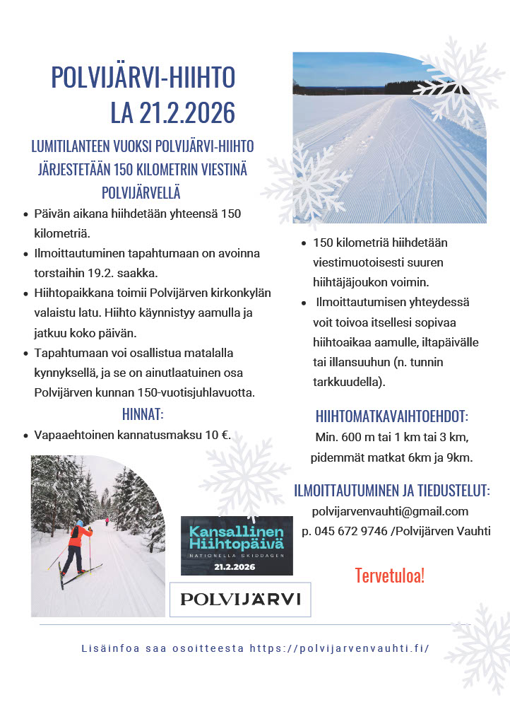 Tapahtuma järjestetään lauantaina 21.2.2026 Polvijärven kirkonkylän ladulla 150 kilometrin pituisena viestinä Polvijärven kunnan 150-vuotisen historian merkeissä.